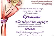 Театральный коллектив "Сәлам" принял участие в V111 Республиканском конкурсе сценического искусства "Театр как театр" и был награжден грамотой в номинации "За творческий подход".