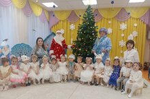 Сегодня в нашем детском саду прошёл самый первый новогодний утренник в группе раннего возраста. Малыши пришли нарядные, превратившись в весёлых зайчиков, красивых снежинок. Все закружились в новогоднем хороводе. Малыши веселились у нарядной ёлочки с добрым Дедушкой Морозом, красавицей Снегурочкой, шустрым Зайчонком. Они водили с ними хороводы, играли в снежки, танцевали с погремушками. Малыши со снегурочкой поиграли в волшебную игру «Ёлочка свети!». Помогли Снегурочке зажечь огоньки на новогодней, праздничной елочке. Она засияла разноцветными огнями. Со снегурочкой Девочки - Снежинки в красивых платьицах закружились в лёгком танце у новогодней ёлки. Вместе с зайчиком наши маленькие зайчата отплясывали весёлый танец. Дедушка Мороз в конце праздника всем подарил подарки. Утренник прошёл в теплой сказочной атмосфере.