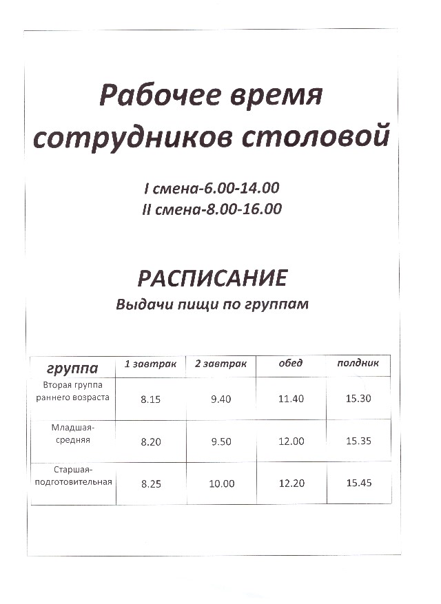 Выдача пищи осуществляется строго по утверждённому графику только после проведения приёмочного контроля бракеражной комиссией. (График выдачи готовых блюд).