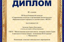 " Конспект внеклассного мероприятия - Война и право".Награждена Дипломом lll степени.Тарих һәм җәмгыять белеме укытучысы Белякова Л. Н. "ФГОС нигезендә тәрбия - белем бирү процессын оештыруның заманча алымнары" дигән lll республика конкурсында катнашты "Класстан тыш чара конспекты - сугыш һәм хокук."Lll дәрәҗә Дипломы белән бүләкләнгән.