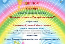 Наши педагоги принимали участие во II Республиканском конкурсе "Народы разные - Республика одна". Учитель татарского языка Хамматова Г.Г. принимала участие в номинации "Лучшее блюдо национальной кухни "Кулинарный этюд"" и получила Гран-при, также воспитатель Сафина А.И. принимала участие в номинации "Лучшая творческая работа "Я - мастер!"" получила Гран-при.