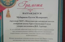 В честь Дня учителя руководитель отдела образования Мензелинского района Петряев Л.В. посетил кадетскую школу-интернат. Он поздравил учителей с праздником и пожелал им успехов в работе. Леонид Валерянович приехал не с пустыми руками, он вручил грамоту от имени главы Мензелинского района Салахова А.Ф. директору кадетской школы-инетрнат Минибаеву И.И., а так же грамоту отдела образования Мензелинского района Мубаракову Р.М. Руководитель отдела образования Леонид Валерянович побдлагодарил их за многолетний добросовестный педагогический и управленческий труд, активное решение проблем образования и воспитания подрастающего поколения, за высокое чуство ответственности и профессионализм.