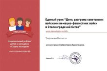2 февраля 2019 г учитель истории( Белякова Л.Н) приняла участие в организации Единого урока «День разгрома советскими войсками немецко-фашистких войск в Сталинградской битве», а кадеты 11 кл успешно прошли викторину по данной теме и награждены сертификатами.
