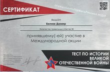 Ф, соотечественников, проживающих за рубежом, иностранных граждан РФ о ВОВ( истории победы над фашизмом).Тест из 30 вопросов, касающихся героев , военных действий, жизни в тылу и т.д. Все участники акции получили сертификаты.
