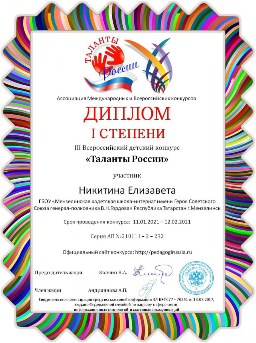 Опубликовано: 22.01.2021Никитина Елизавета, ученица 7 кл (учитель Беляков Л.Н) приняла участие в lll Всероссийском детском конкурсе " Таланты России".
