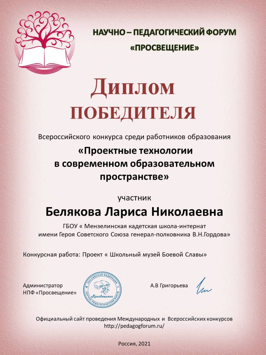 Опубликовано: 25.01.2021Учитель истории и обществознания Белякова Л.Н. приняла участие во Всероссийском конкурсе среди работников образования "Проектные технологии в современном образовательном пространстве".