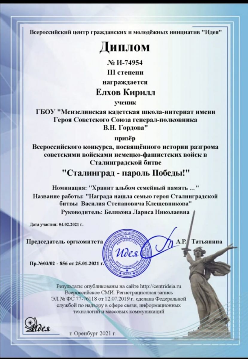 Опубликовано: 24.02.2021Ученик 7 класса Елхов Кирилл стал призёром Всероссийского конкурса "Сталинград- пароль Победы" в номинации "Хранит альбом семейный тайны".