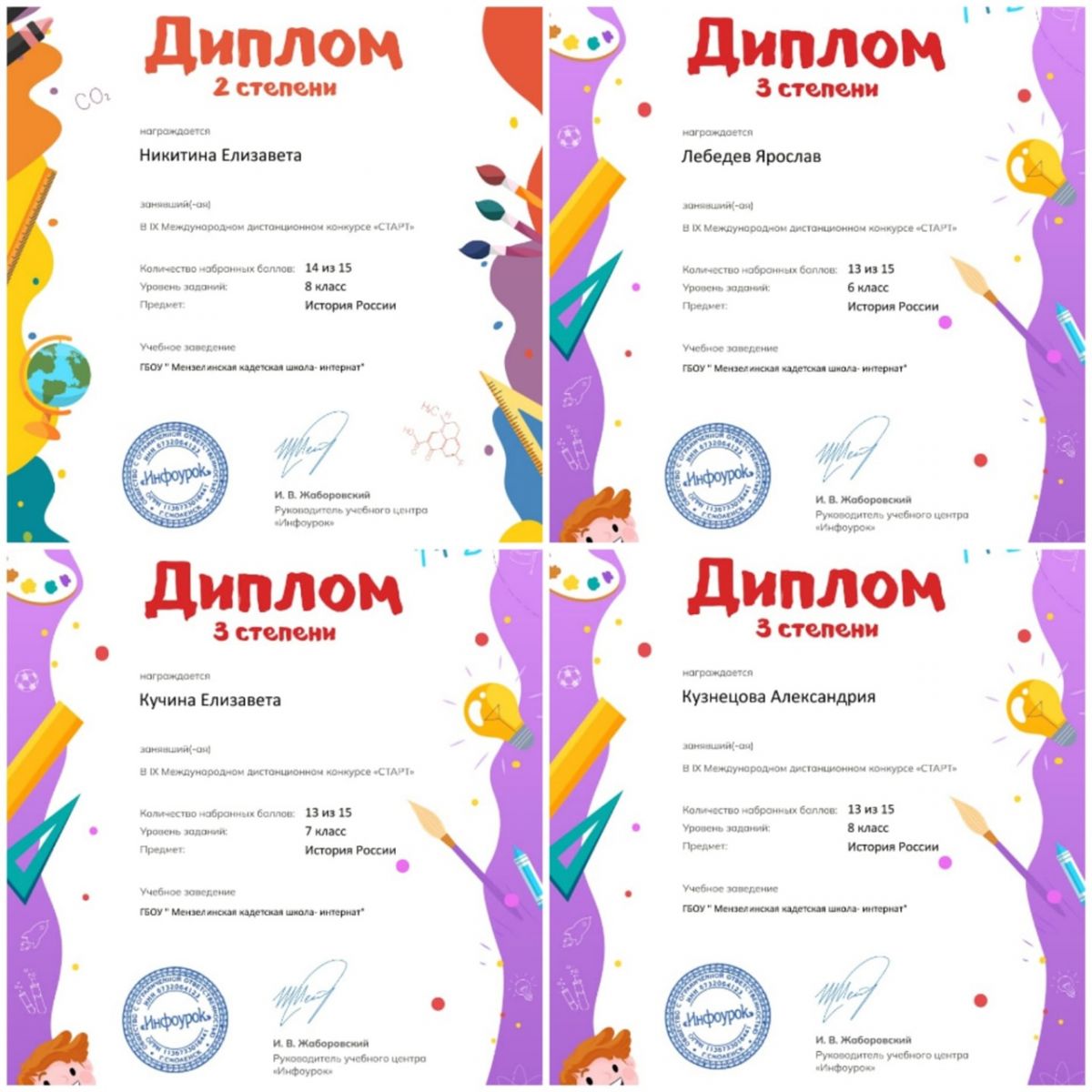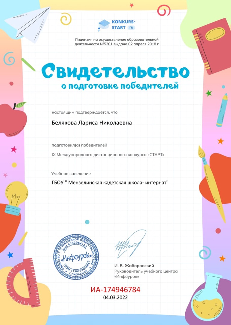 5 нче марттан 13 нче мартка кадәр 6-9 нчы сыйныф кадетлары тарих фәненнән "Старт" IX халыкара дистанцион конкурсында катнаштылар. Конкурс нәтиҗәләре буенча бүләкләнде: I дәрәҗә Диплом- Елшина Ю(6 кл), Пугачев М(7кл). 2 дәрәҗә Диплом- Никитина Е(8кл) 3 дәрәҗә Диплом- Лебедев М(6кл),Кучина Е (7кл), Кузнецова А (8кл). Сертификат-Огорельцев М (7кл),Лебедев Б(8 кл), Никитин В (9 кл).