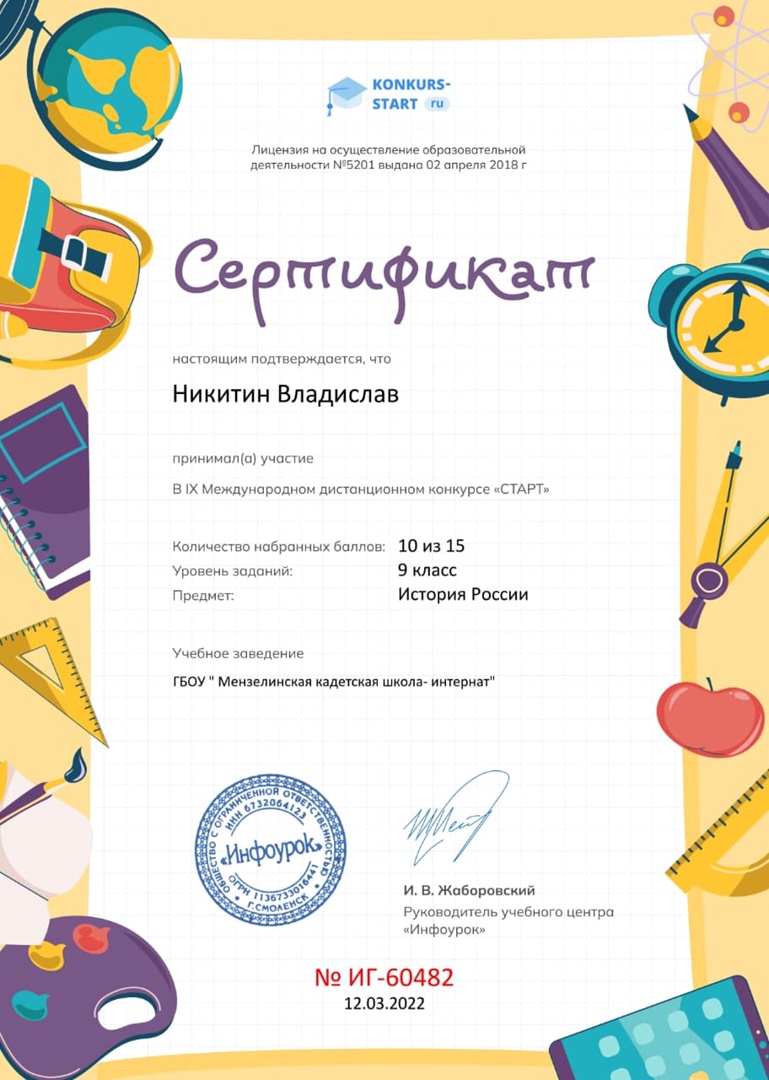 Опубликовано: 13.03.2022С 5 по 13 марта кадеты 6-9 кл приняли участие в lX Международном дистанционном конкурсе " Cтарт" по истории.