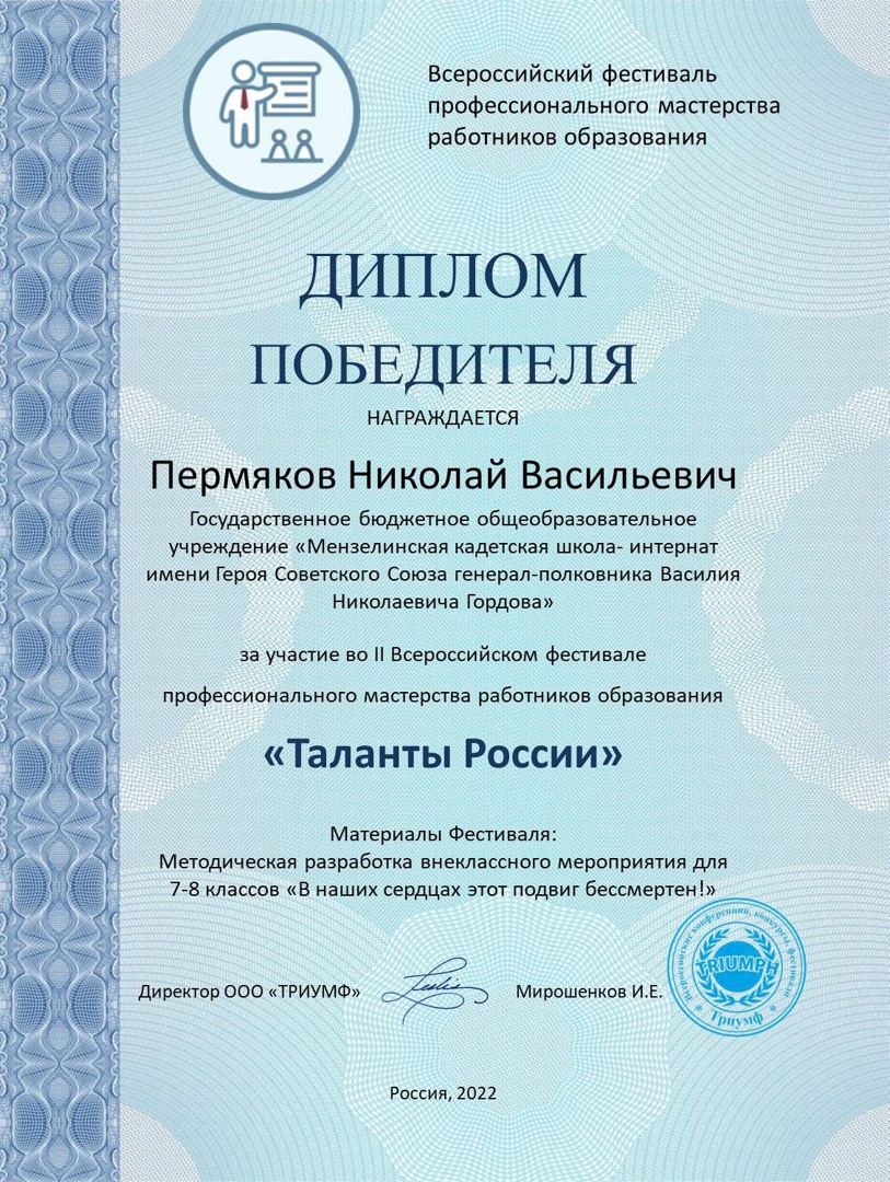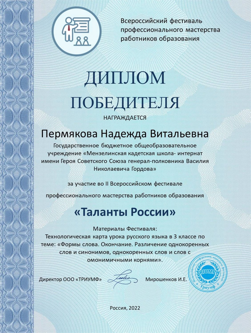 Безнең педагоглар Лебедева Е.у., Пермякова Н.В., Никитина С.К. һәм Пермяков Н. В. мәгариф хезмәткәрләренең « Россия талантлары» икенче Бөтенроссия һөнәри осталык