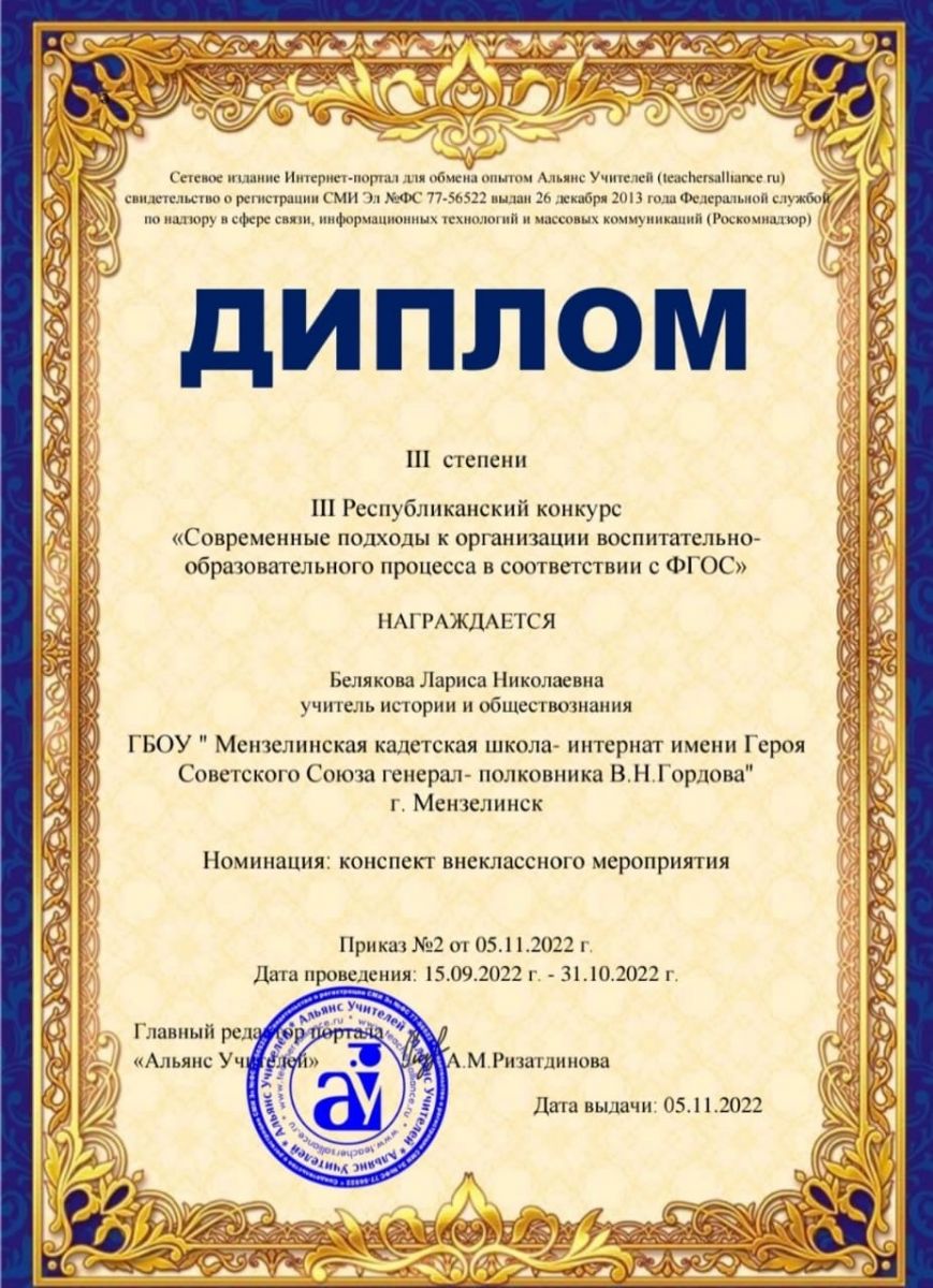 Тарих һәм җәмгыять белеме укытучысы Белякова Л. Н. "ФГОС нигезендә тәрбия - белем бирү процессын оештыруның заманча алымнары" дигән lll республика конкурсында катнашты "Класстан тыш чара конспекты - сугыш һәм хокук."Lll дәрәҗә Дипломы белән бүләкләнгән..jpg)