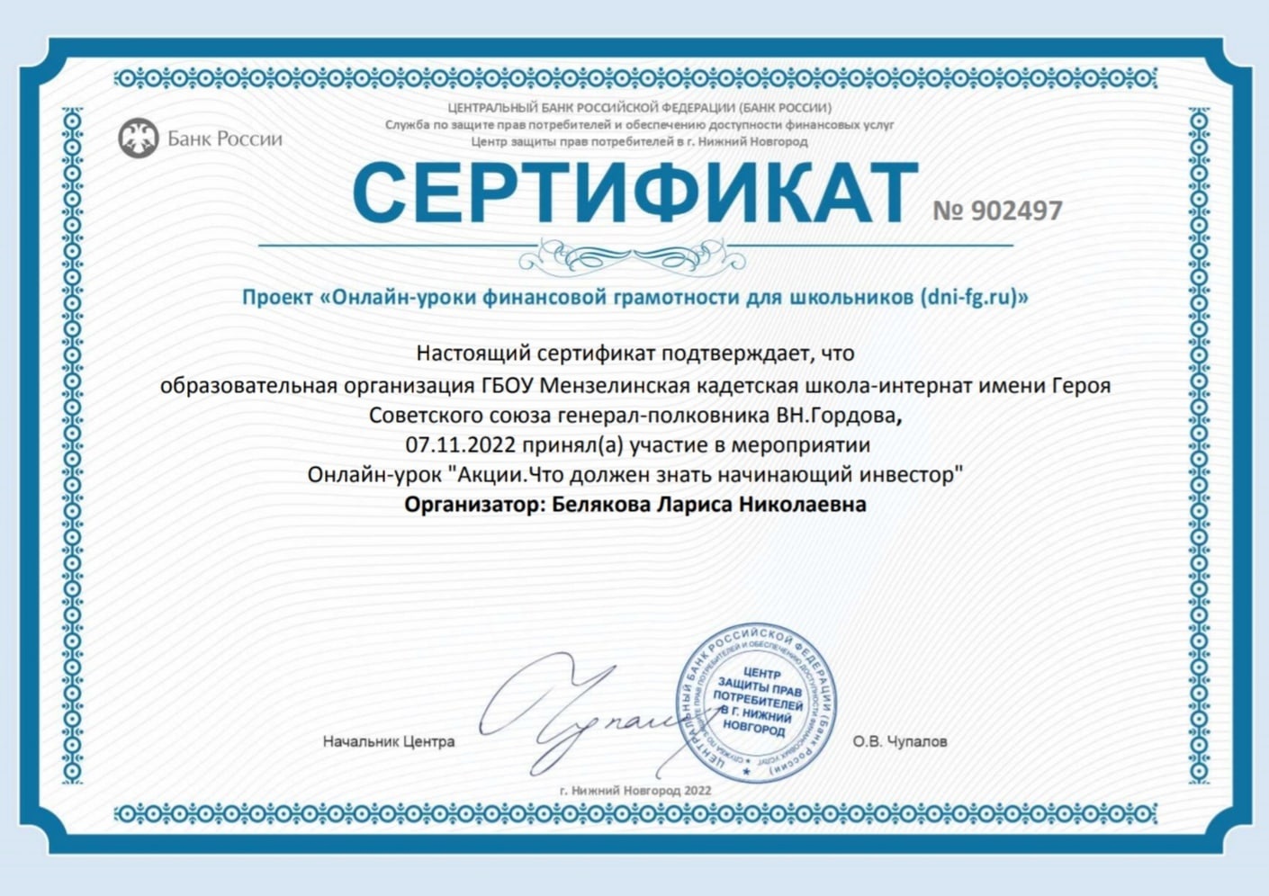 Опубликовано: 09.11.20227-8 ноября кадеты 6 класса приняли участие в мероприятии Онлайн уроки по финансовой грамотности " С деньгами на Ты или Зачем быть финансово грамотным? Акции.Что должен знать начинающий инвестор"