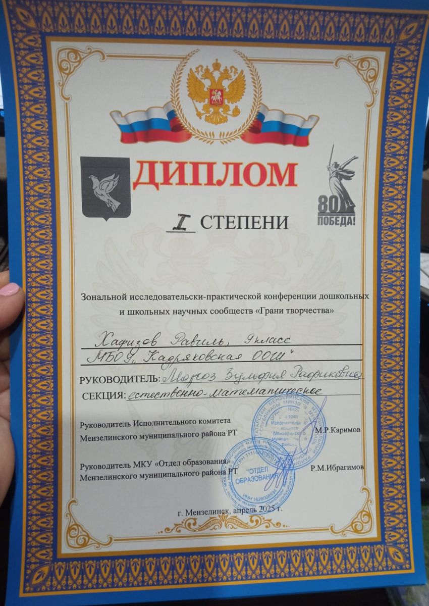 1 место на зональном конкурсе "Грани творчества" занял ученик 9 класса Хафизов Равиль Динарович (руководитель проекта Зульфия Рафиковна Мороз, учитель математики, физики и информатики), защитив проект по физике «Виды двигателей и их применение на примере создания самоходной тележки для вывоза навоза из ЛПХ (личного подсобного хозяйства). Ученики наши – жители села, поэтому тема актуальная для села.