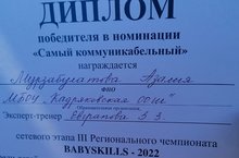 Поздравляем победителя сетевого этапа III Регионального чемпионата BABYKILS-2022 среди детей дошкольного и младшего школьного возрата Мурзабулатову Азалию, ученицу 2 класса. Руководитель Евграпова З.З.