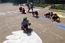 Мы рисуем открытку поздравление для односельчан на асфальте и украшаем окна