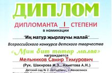 Бөтенроссия балалар иҗаты "Мин бит Татар малае-2023" конкурсында катнашып "Иң матур җырлаучы" номинациясендә 1нче урын яулаган Мельников Самирны котлыйбыз! Молодец Самир!