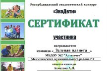 Команда “Зеленая планета” ДОУ №2 “Алтынчеч” награждается сертификатом за участие в республиканском экологическом конкурсе “ЭкоДети-2022”.