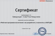 Заведующая МБДОУ № 2 "Алтынчеч" приняла участие в вебинаре на тему: "Рабочая программа воспитания: как разработать и включить в ООП ДО". Вице - президент ИМОС по дошкольному образованию, Скоролупова Оксана Алексеевна рассказала об изменениях в законодательстве по вопросам воспитания обучающихся.