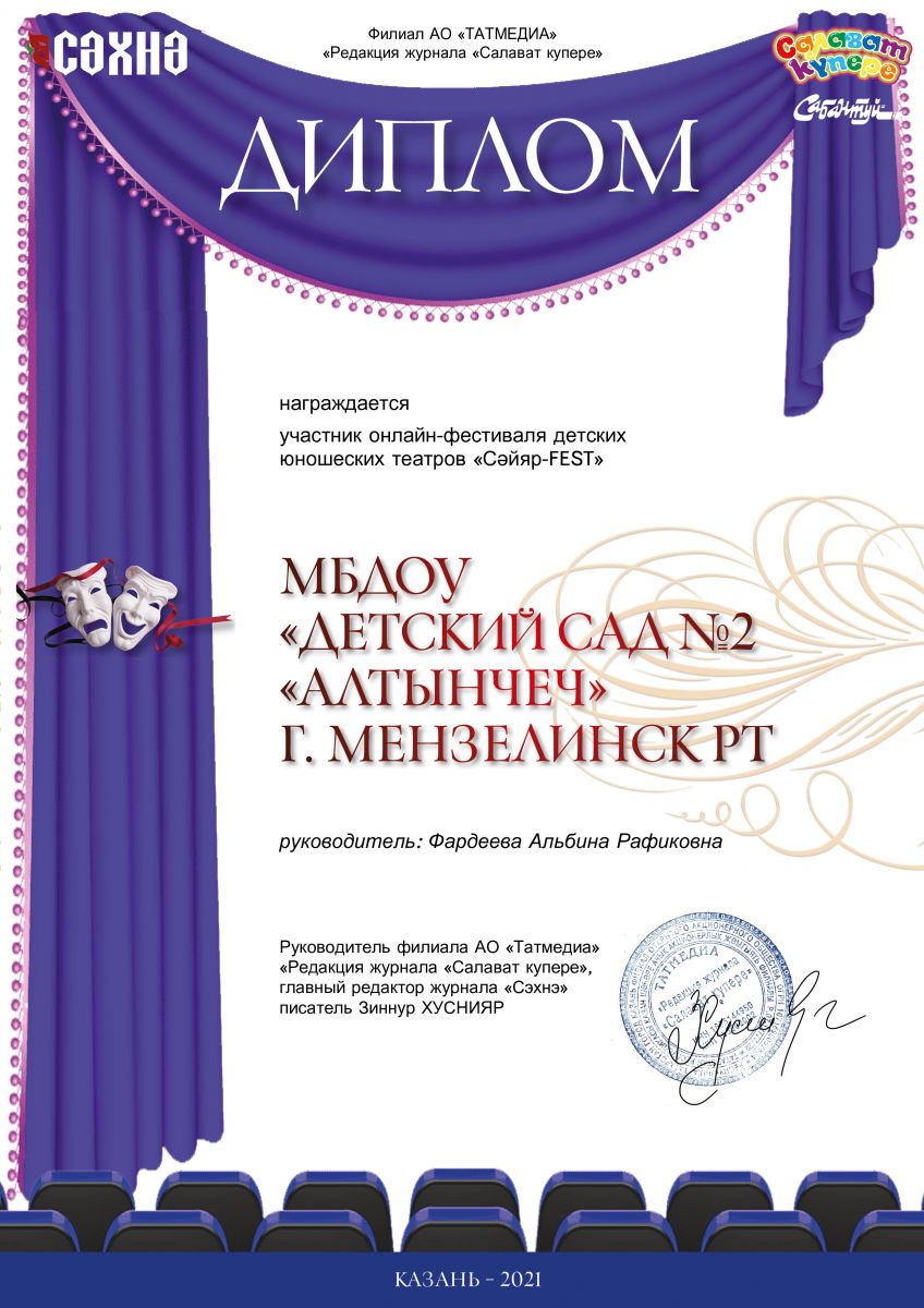 Наш детский сад принял участие в онлайн-фестивале детских юношеских театров "Сәяр - FEST" организаторм которого был филиал АО "ТАТМЕДИА" "Редакция журнала "Салават күпере".