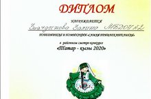 14 октября 2020 года на базе МБДОУ № 11 "Шатлык" прошел смотр - конкурс "Татар кызы - 2020", наша воспитанница старшей группы "Күбәләкләр" приняла активное участие и была награждена дипломом победителя в номинации "Самая привлекательная". Поздравляем!!!