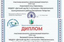 2 нче номерлы «Алтынчәч» балалар бакчасы Кирилова Алсу Равил кызы, Вәлиева Алинә Зәкәри кызы "профсоюз репортеры" - 2020 Бөтенроссия конкурсында актив катнаштылар. «Бөек Ватан сугышы герое турында Очерк»конкурсы номинациясе.