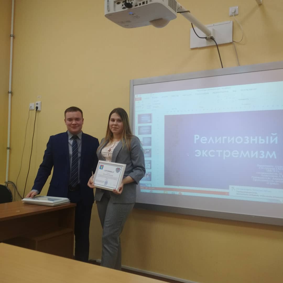 Опубликовано: 22.10.2019В рамках месячника по противодействию экстремизма и терроризма студентка 104 группы Ермилова выступила с докладом на антитерростическую тему : « Терроризму – нет», которая проходила на базе педагогического колледжа имени Мусы Джалиля среди студентов ССУЗов города Мензелинска и была удостоена сертификата участника.