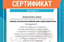 Ученица 2 класса Алексеева Анна приняла участие во Всероссийской акции, приуроченной к Международному дню родного языка. (Рук.Новикова В.В.)