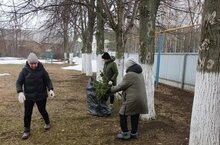 В рамках двухмесячника сотрудники нашей школы вышли на субботник. Они занимались уборкой территории школы от мусора.