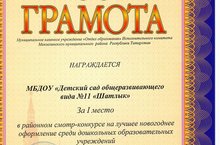 МБДОУ № 11 "Шатлык" занял ПЕРВОЕ место в районном смотре-конкурсе на лучшее новогоднее оформление среди дошкольных образовательных учреждений.