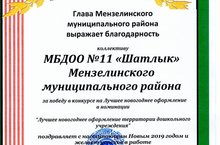 Лучшее новогоднее оформление 25.12.2018 Глава Мензелинского муниципального района выражает благодарность коллективу МБДОУ №11 "Шатлык" за победу в конкурсе на Лучшее новогоднее оформление