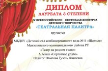 Воспитанница МБДОУ # 11 "Шатлык" Маузиева Саида, руководитель Фоатова Г. Ф., стала дипломантом III степени Всероссийского конкурса чтецов стихов Юлдуз Шараповой «Тәмле сүзләр» в номинации «Стихи Юлдуз Шараповой на татарском языке». От всей души поздравляем Саиду Маузиеву и, конечно, руководителя — Фоатову Г. Ф. с этим замечательным достижением! Желаем не останавливаться на достигнутом, вдохновляться новыми творческими идеями и одерживать ещё много ярких побед! Пусть любовь к родному языку и поэзии всегда приносит радость и признание!