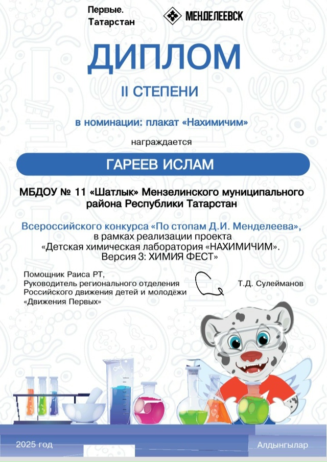 Воспитанники МБДОУ # 11 "Шатлык" Гареев Ислам, Сундрунов Егор, Филаретов Михаил и Красильникова Диана стали участниками Всероссийского конкурса, организованного в рамках проекта «Детская химическая лаборатория „НАХИМИЧИМ“. Версия 3: ХИМИЯ ФЕСТ», который проводится при грантовой поддержке Движения Первых. Проект направлен на развитие интереса детей к химии и естественным наукам, создание условий для раскрытия творческого потенциала и формирования научных представлений о мире веществ. По итогам конкурса Гареев Ислам в номинации: плакат "Нахимичим" занял 2 место, Филаретов Михаил в номинации: видеоролик "Про химию устами ребёнка" занял 2 место, Красильникова Диана в номинации: плакат "Нахимичим" 2 место.