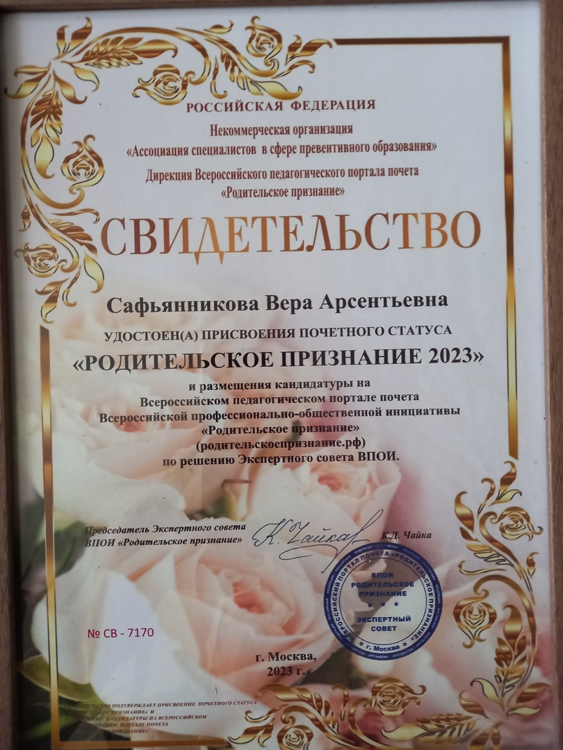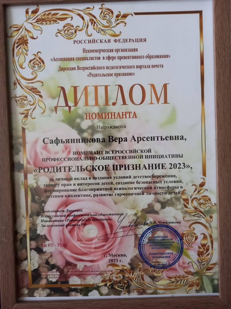 Поздравляем Сафьянникову Веру Арсентьевну, номинанта Всероссийской профессионально-общественной инициативы "РОДИТЕЛЬСКОЕ ПРИЗНАНИЕ 2023", за личностный вклад в создание условий детствосбережения, защиту прав и интересов детей, создание безопасных условий, формирование благоприятной психологической атмосферы в детском коллективе, развитие гармоничной личности детей. -