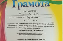 Воспитатель Болкисева Л. А. принимала участие в конкурсе на лучшую методическую разработку по обучению детей дошкольного возраста игре в шахматы «Шахматная школа для дошколят» в номинации «Лучший конспект занятия» - I место. Поздравляем!!!