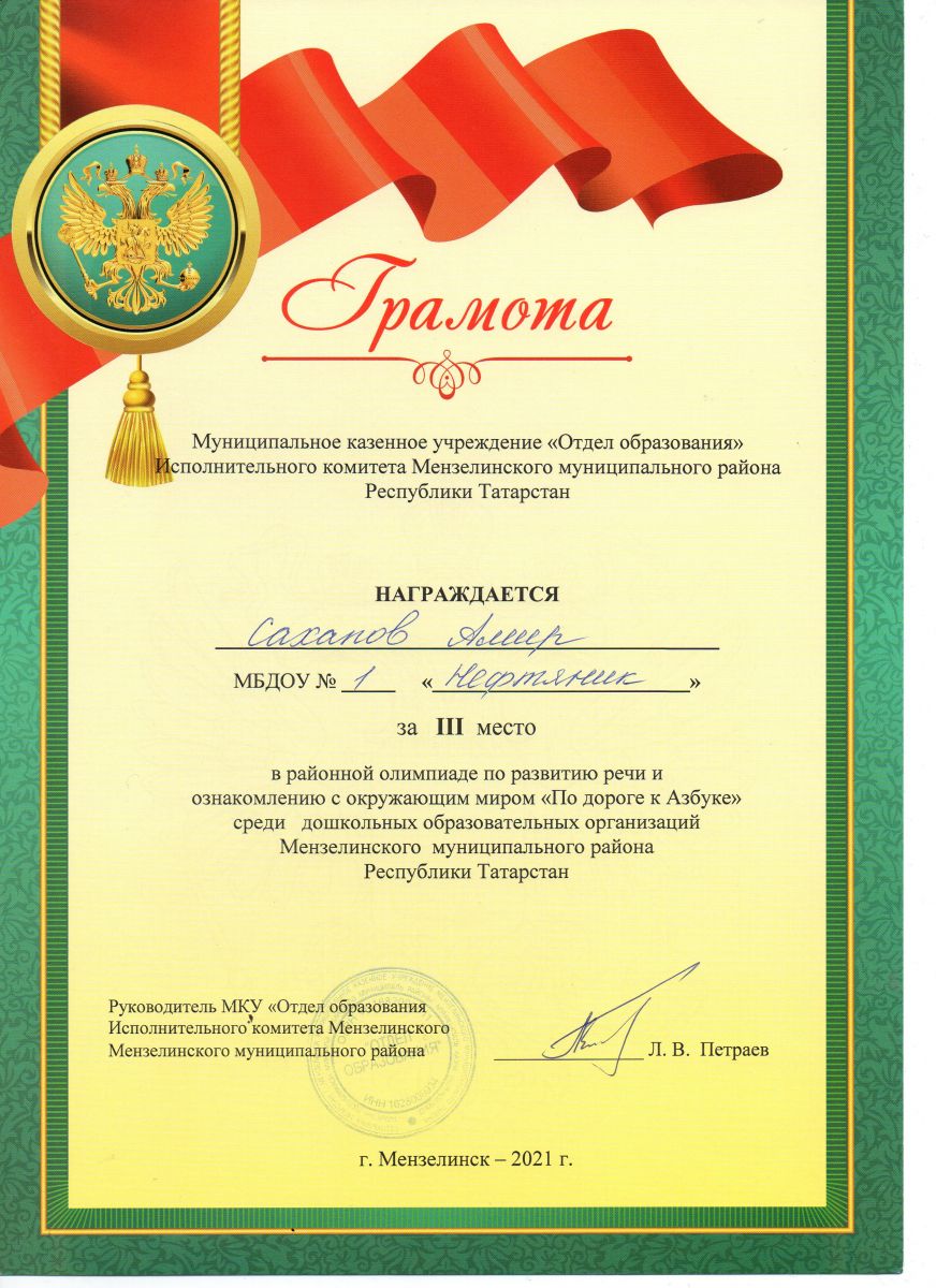 Сегодня в МБДОУ №11 "Шатлык" прошла районная олимпиада по развитию речи и ознакомлению с окружающим "По дороге к Азбуке", в которой принимал участие наш воспитанник Сахапов Амир и занял III место! Поздравляем, МОЛОДЕЦ!!!