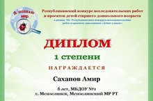 Завершился республиканский конкурс исследовательских работ и проектов детей старшего дошкольного возраста "Я познаю мир". В секции "Мир вокруг меня" под руководством воспитателя Бариевой Л.Ф. участвовали наши воспитанники Сахапов Амир и Фролова Арина и заняли I место. Поздраляем!!!