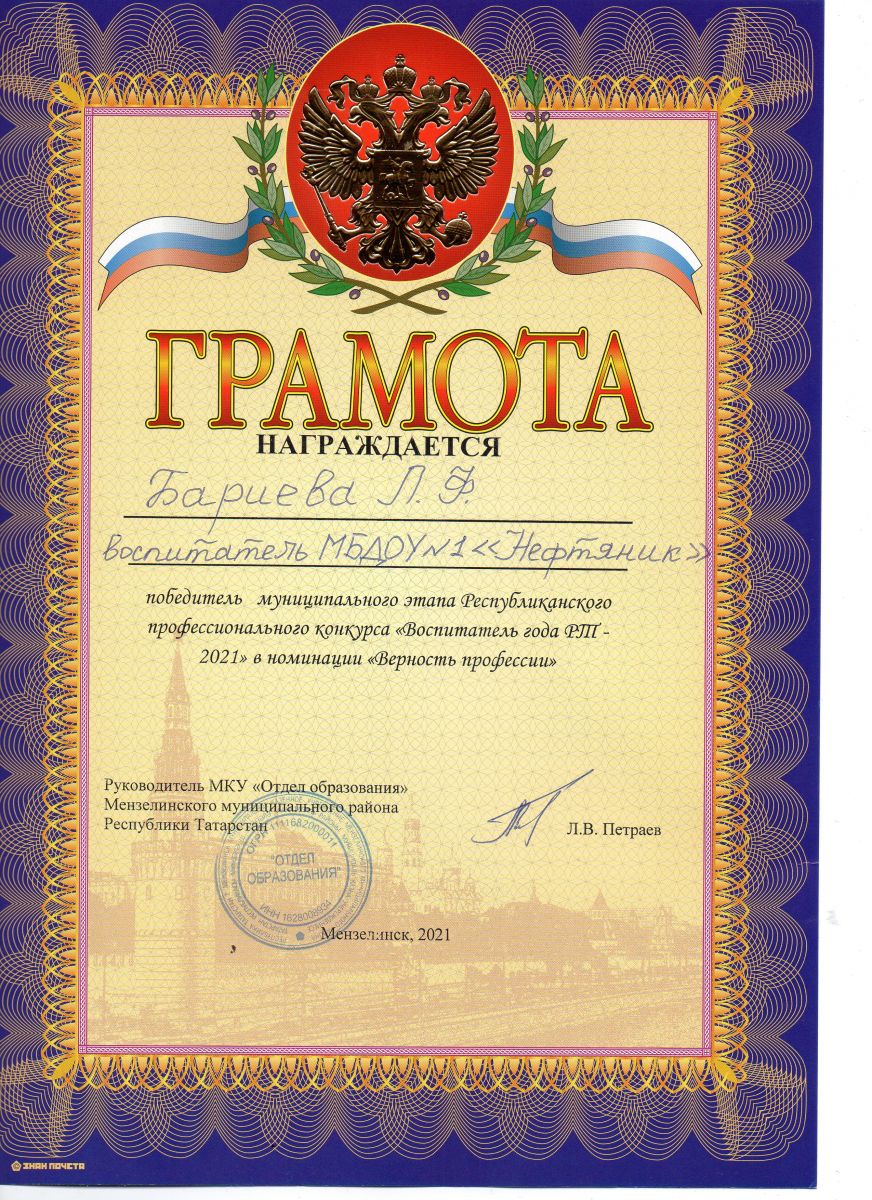 Завершился муниципальный этап Республиканского профессионального конкурса "Воспитатель года РТ - 2021". Честь нашего детского сада защищала опытный педагог Бариева Люция Фаукасовна. Она стала победителем в номинации "Верность профессии". Мы поздравляем Люцию Фаукасовну, желаем творческих успехов в профессиональной деятельности, здоровья и благополучия!