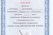 Сегодня на базе МБДОУ №4 "Гномик" прошел муниципальный этап I Международного литературного конкурса чтецов "ДЖАЛИЛОВСКИЕ ЧТЕНИЯ", среди воспитанников детских садов города. В номинации "М.Джалиль на татарском" 1 место занял наш воспитанник Иванов Искандер. Поздравляем победителя!!! Молодец!!!