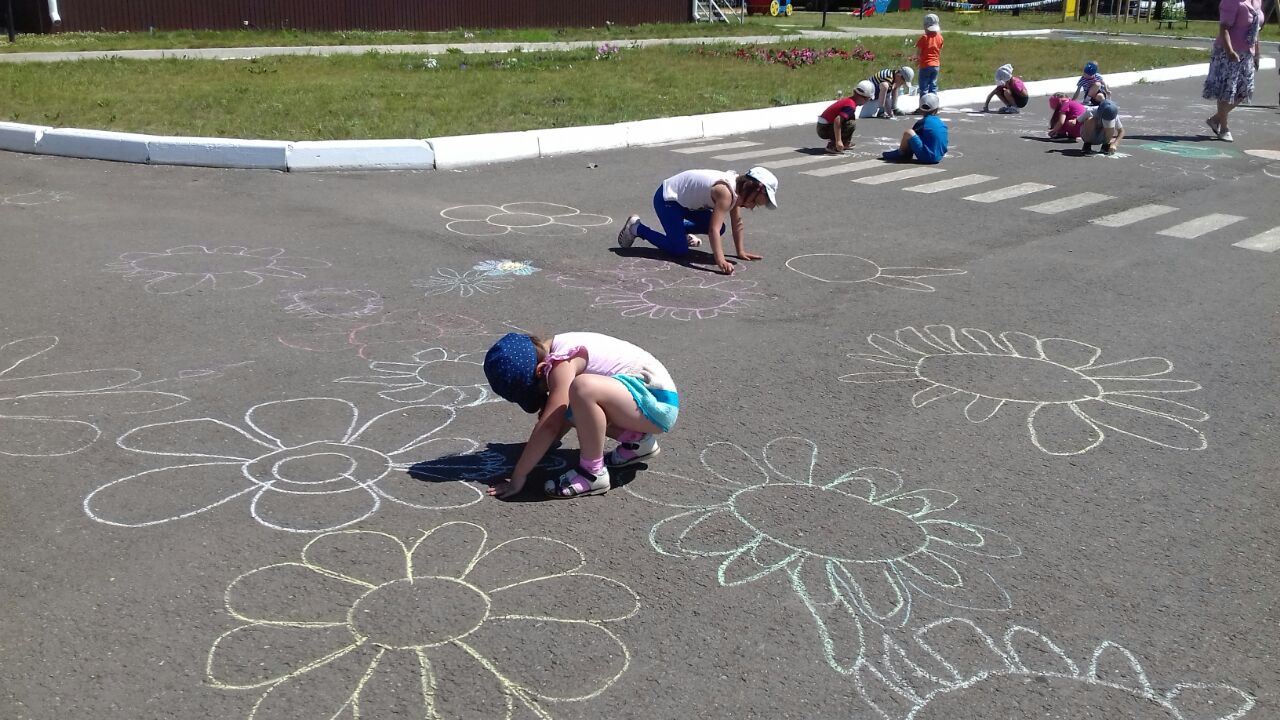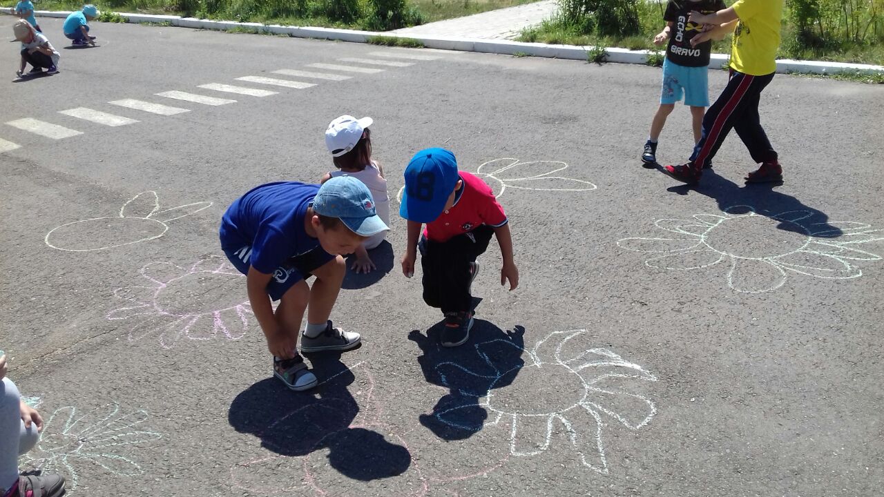 Счастья и любви!В рамках недели "День семьи, любви и верности" дети рисовали на асфальте Ромашку.