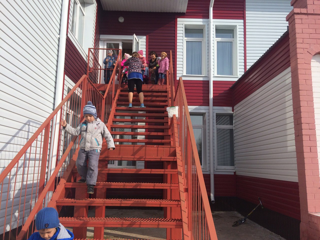 Сегодня у нас в детском саду прошли учения по пожарной безопасности. Сигнал тревоги в детском саду прозвучал в разгар занятий. Воспитатели быстро собрали детей, и организовано вывели на улицу. И всего за 5 минут детский сад был выведен на улицу, проверен по списочному составу.