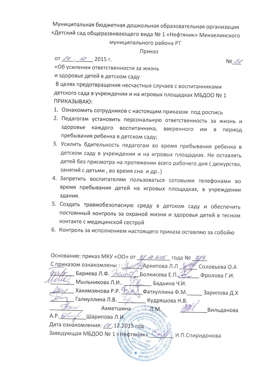 приказ об усилении ответственности за жизнь и здоровье детей в детском саду<<<