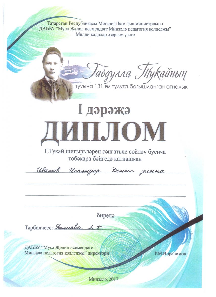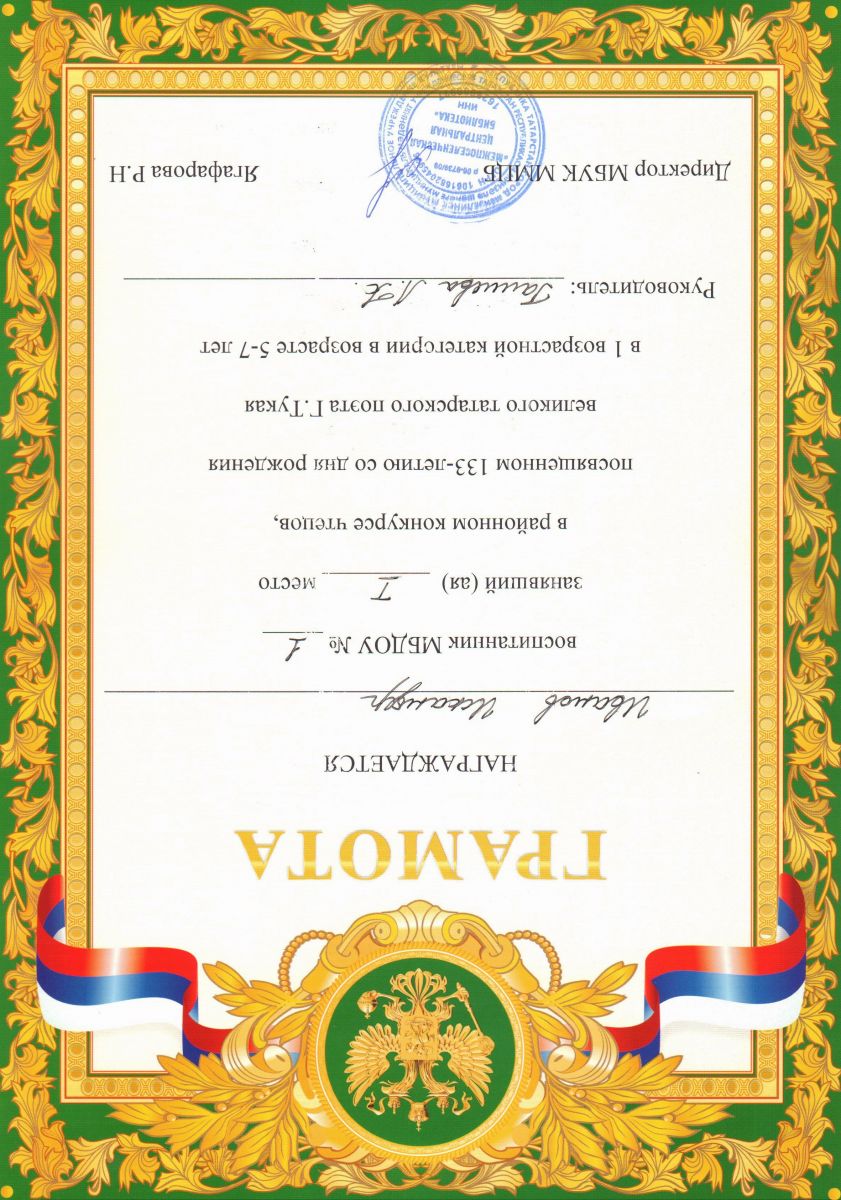Грамота 1 место конкурс чтецов посвящен.133 ти летию Г.Тукая воспитан. Иванов Искандер