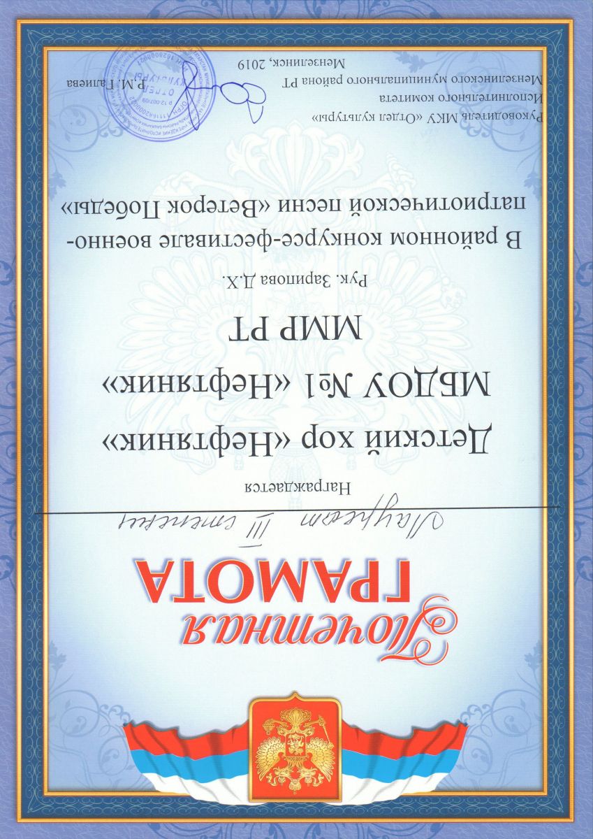 Грамота лауреаты 3 степени Детский хор "Нефтяник" "Ветерок - Победы"
