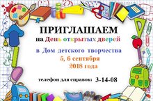 5,6 сентября в Доме детского творчества состоится День открытых дверей. Приглашаем всех желающих ребят посетить наши творческие объединения, ознакомиться с их деятельностью, записаться в кружки. Мы всегда рады вам!