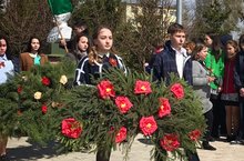 Сегодня прошел митинг в парке Победы. Учащиеся первой школы возложили гирлянду цветов к мемориалу, чтобы склонить головы в дань памяти героев, которые погибли, защищаю Родину.