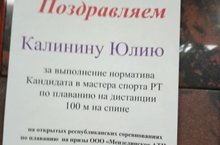 Поздравляем Калинину Юлию с большой наградой - выполнение норматива Кандидата в мастера спорта РТ по плаванию на дистанции 100м на спине. Это большой труд и достойное вознаграждение за него. Дальнейших успехов!!!