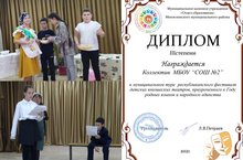 Мәктәпнең "Әкият" театр түгәрәге Республикакүләм театрлар фестивалендә катнашты һәм муниципаль этапта 3 нче дәрәҗә диплом белән бүләкләнде. Җитәкче: Хамаева Г.Ә./Школьный театральный кружок "Экият" принял участие в Республиканском фестивале театров и на муниципальном этапе был награжден дипломом 3-й степени. Руководитель: Хамаева Г. А