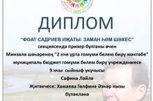 Ученицы средней школы №2 Сафина Л. (Хамаева Г.А.) стала призёром научно – исследовательских чтений имени Фоата Садриева, Айгуль Фаррахова (Минегалиева И.М.) получила сертификат участника/2 нче урта мәктәп укучысы Сафина Ләйлә (Хамаева г. А.) Фоат Садриев исемендәге фәнни-тикшеренү укулары призеры булды, А. Фаррахова (Минегалиева и. М.) катнашучы сертификаты алды