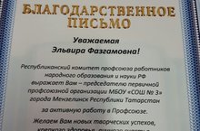 Председатель профкома школы Чигвинцева Э.Ф . награждена «Благодарственным письмом» Республиканского комитета профсоюза работников народного образования и науки РФ, за активную работу в Профсоюзе.