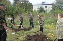 Ежегодно территория нашей школы облагораживается. Когда то посаженные елочки, стали метровыми елями. Вот и в этом году кроме посаженных яблонь, родителями 1-х классов, на уроках технологии под руководством учителя Мильчакова Л.В. вместо тополей высадили вяз с учащимися 5-х классов. Пусть растут и радуют прохожих.